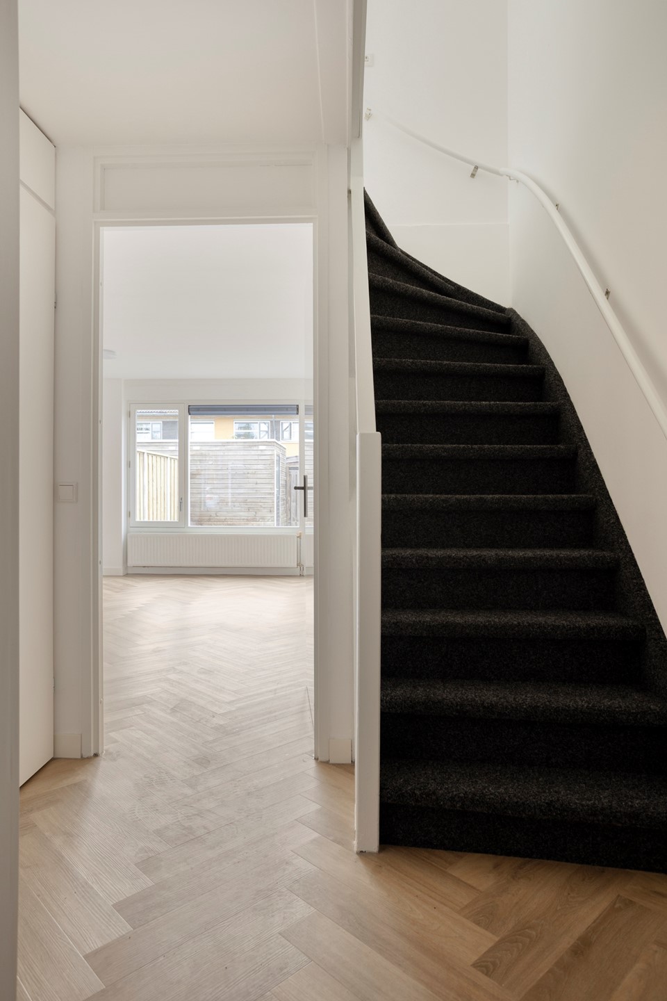 Entree, trapopgang naar de 1e etage, toilet (modern uitgevoerd), doorgang naar de woonkamer, aansluitend de fraaie luxe uitgevoerde keuken.