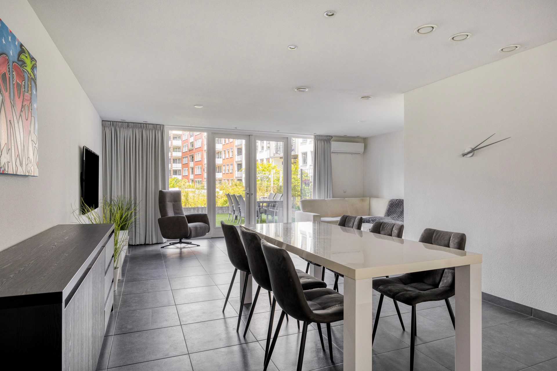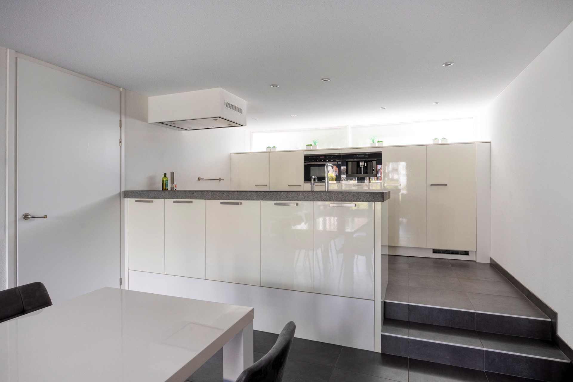 Een halve verdieping hoger bevindt zich de moderne keuken, luxe uitgevoerd met diverse inbouwapparatuur en gelegen op een verhoogd niveau, wat een open maar toch aparte eetkeuken creëert.
