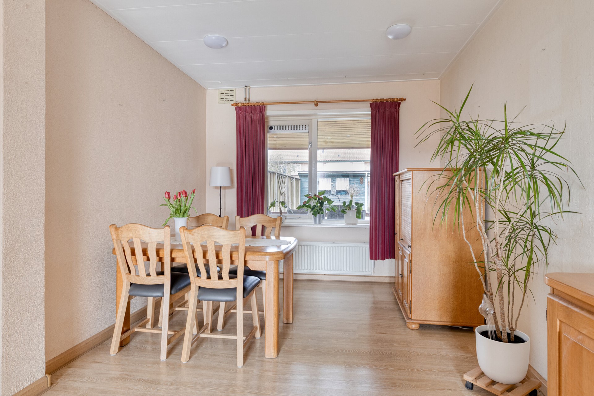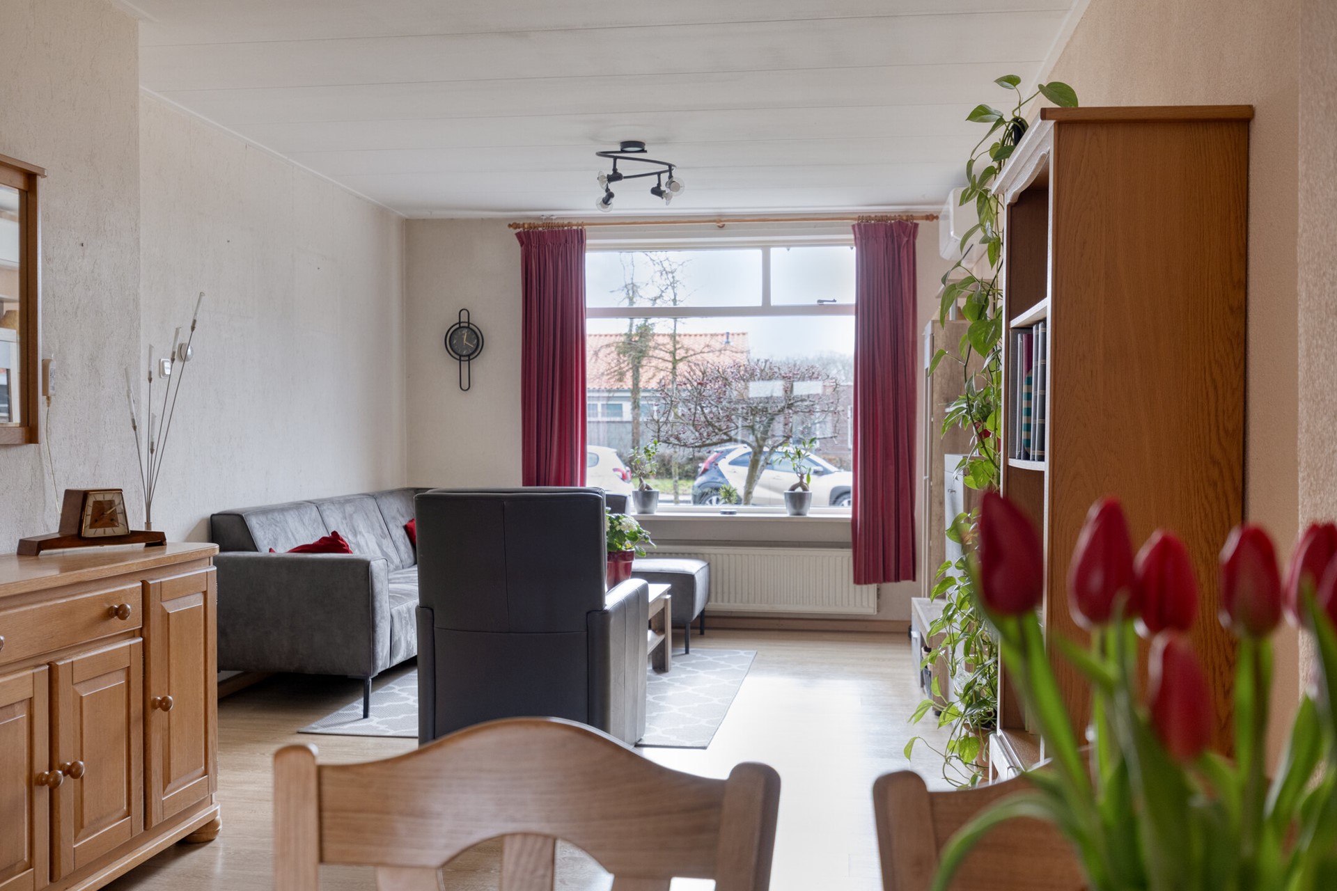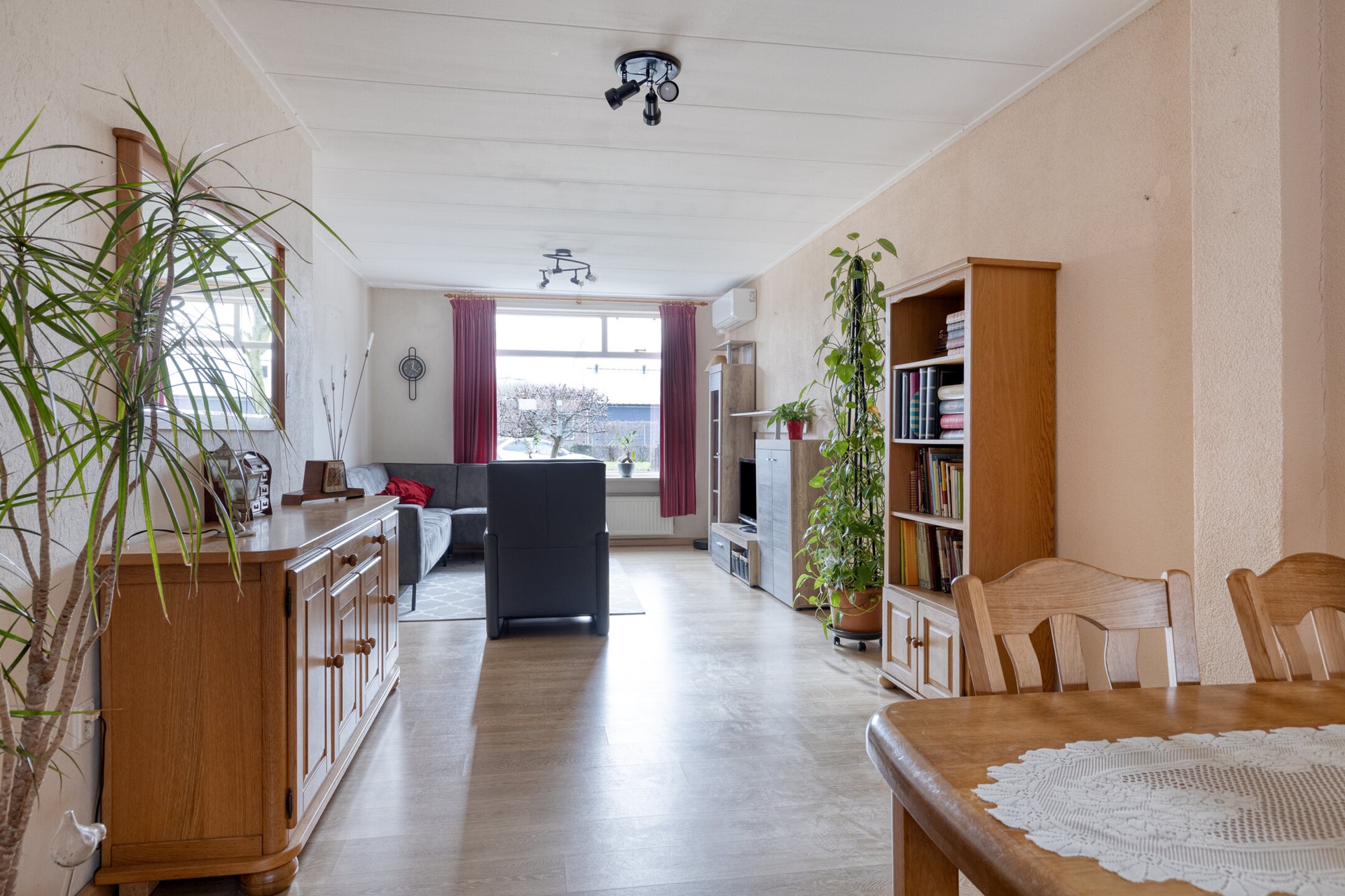 De woonkamer is aan de achterzijde uitgebouwd, wat direct merkbaar is in de leefruimte. Er is voldoende plek voor een royale eethoek én een comfortabele zithoek. Door de neutrale afwerking voelt het geheel rustig aan en kun je er zonder grote aanpassingen in.