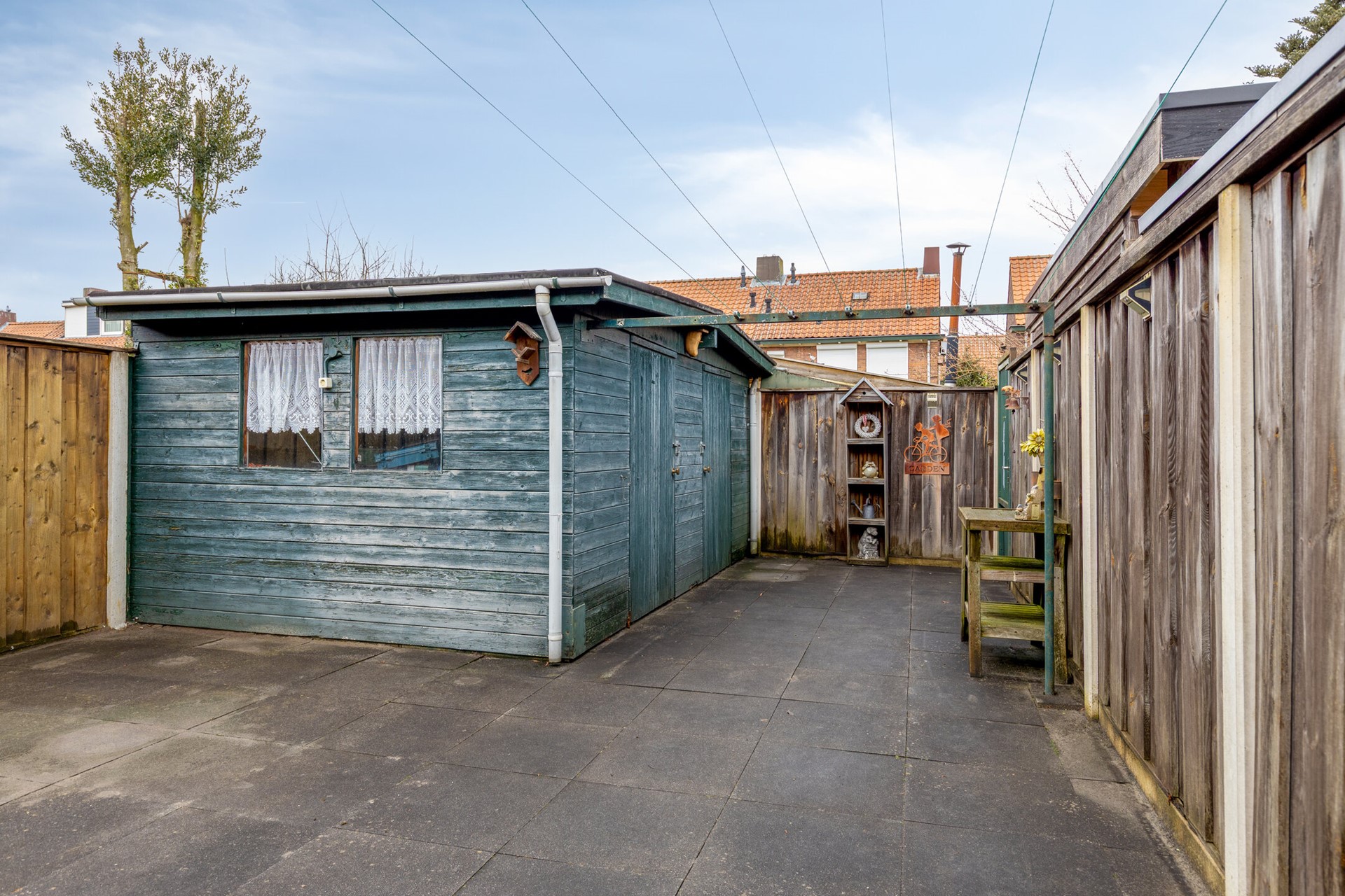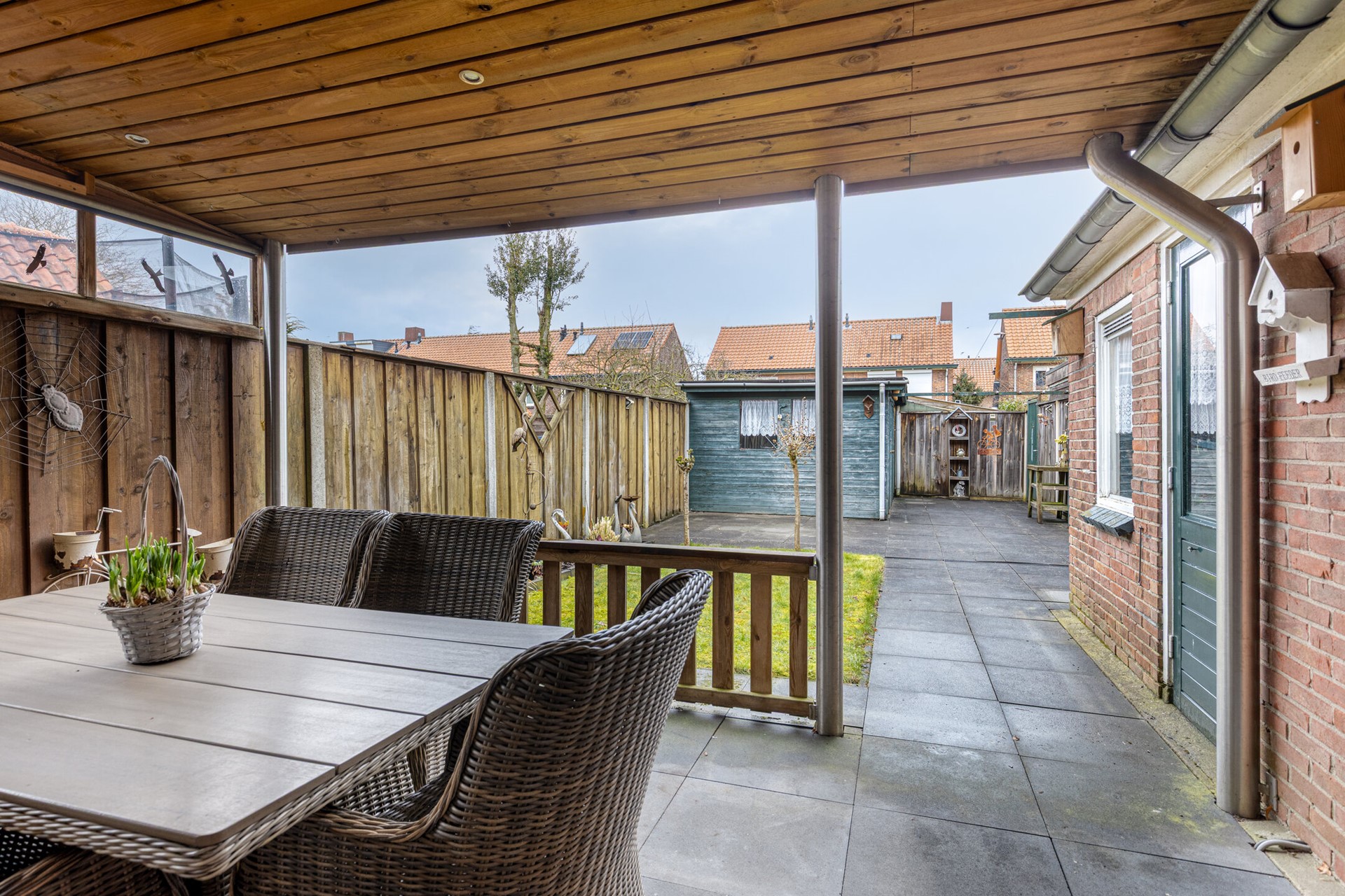 Een diep op het noorden georiënteerde achtertuin met ruime berging en overkapping. Door de diepte kan de tuin omschreven worden als zonnig.