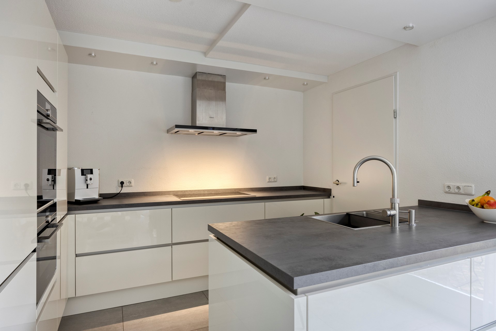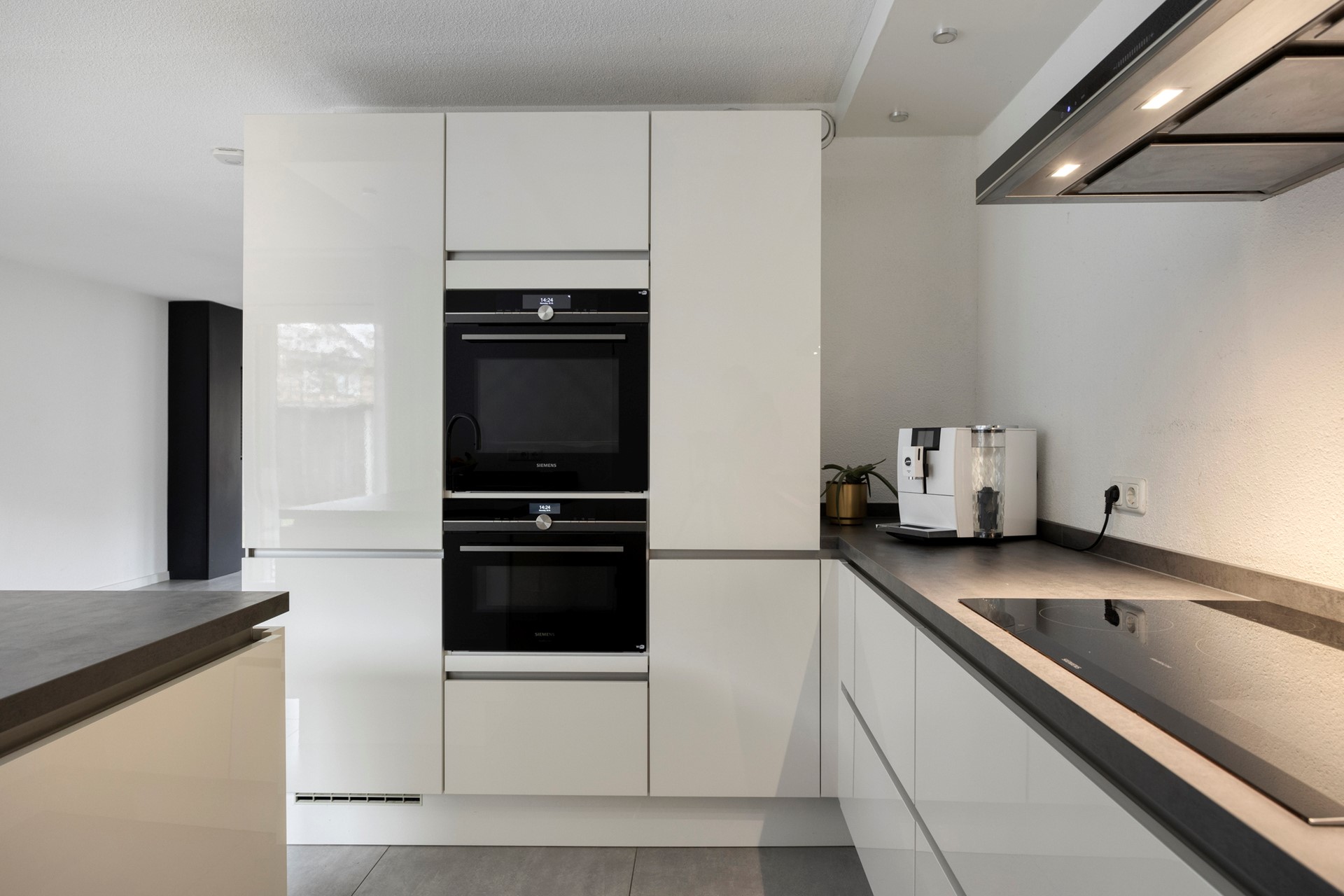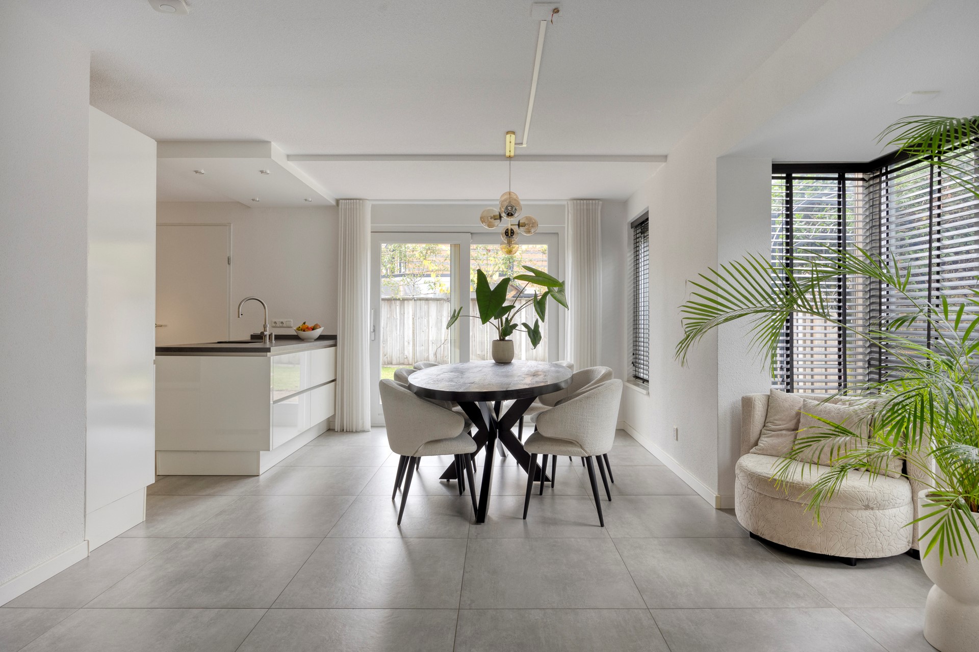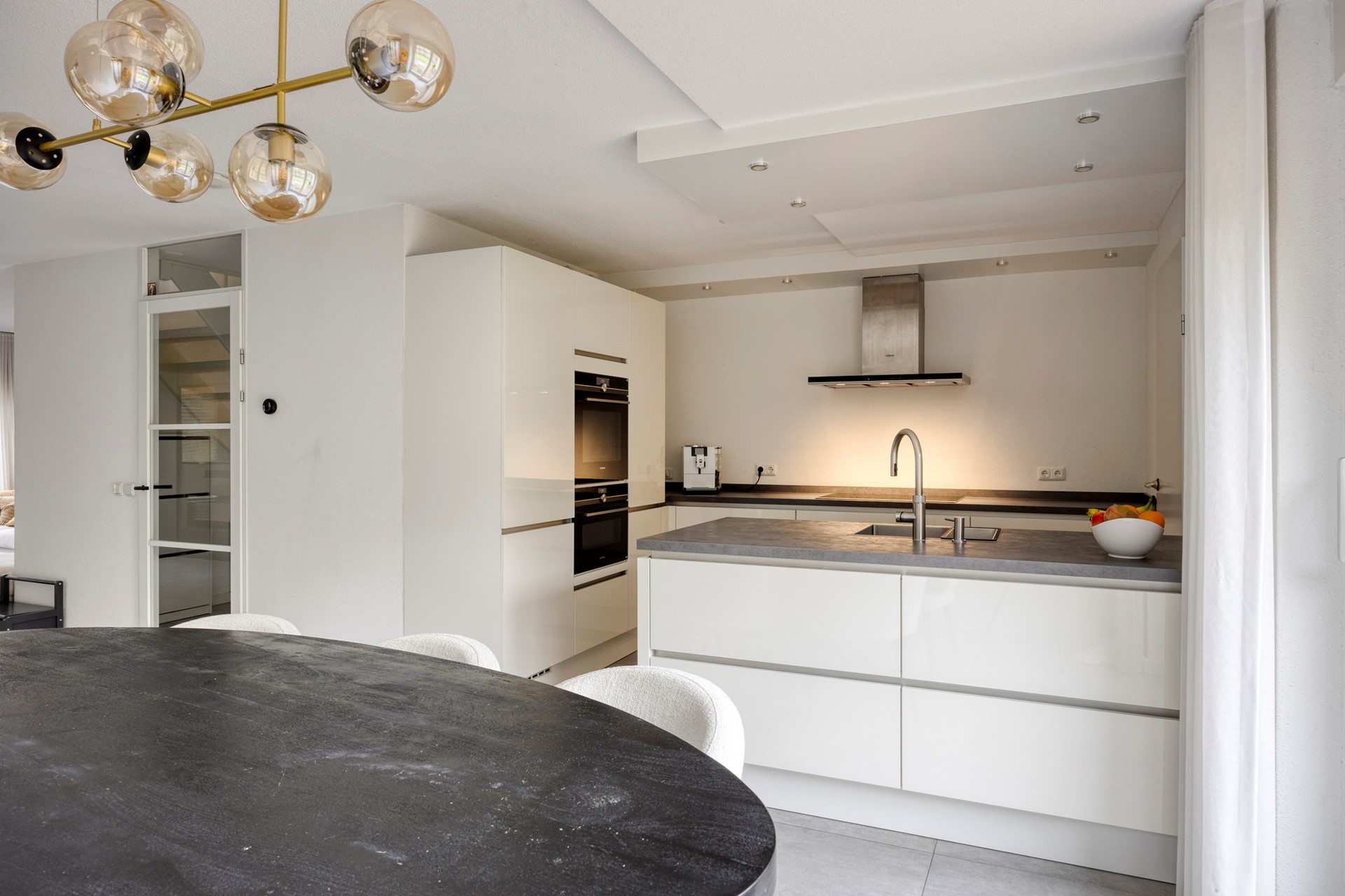 De woonkeuken is een echte eyecatcher – luxe uitgevoerd, met moderne inbouwapparatuur, een sfeervolle erker en dubbele terrasdeuren naar de tuin.