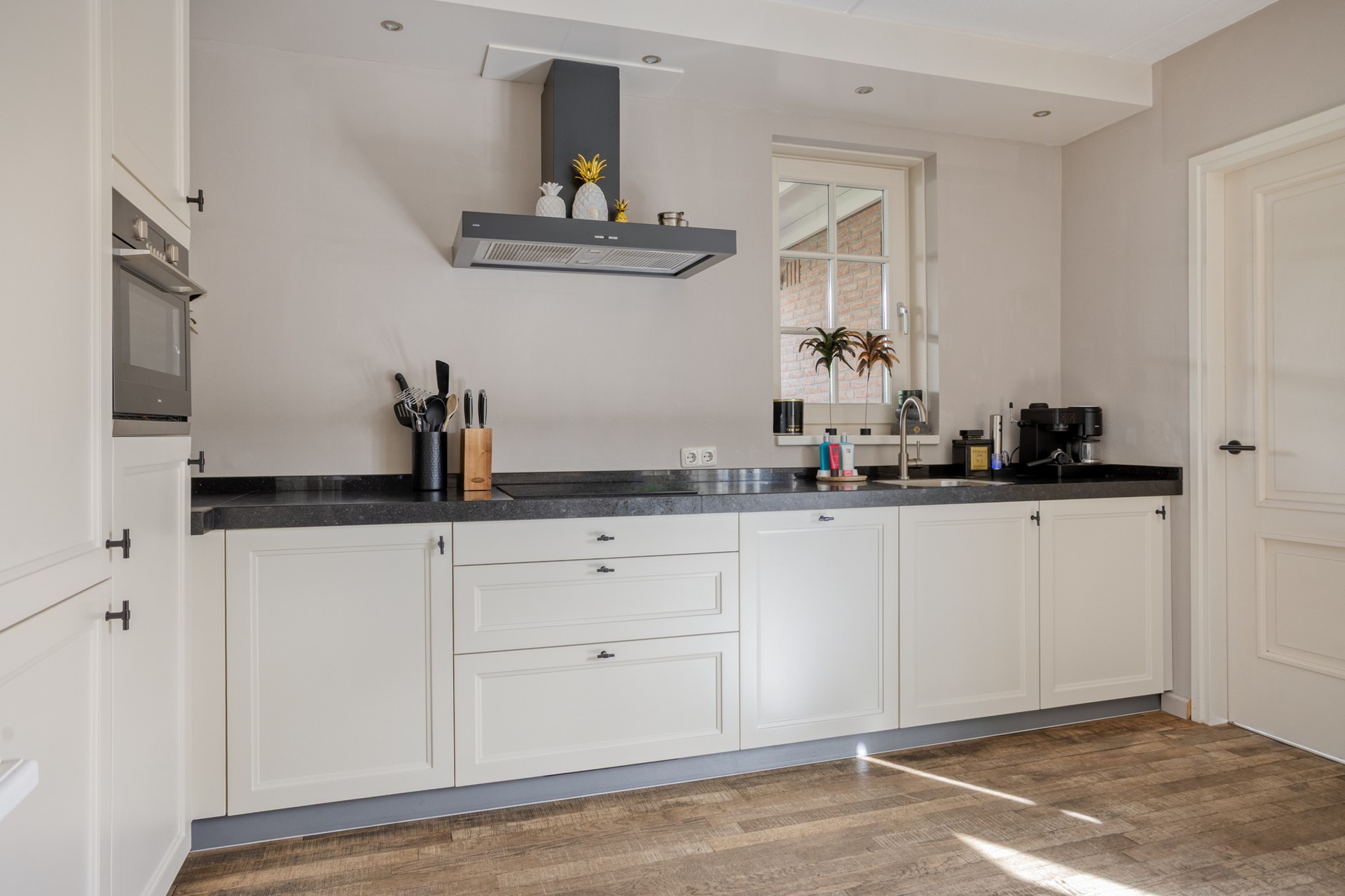 Via ensuite deuren bereik je de ruime woonkeuken. Deze moderne leefkeuken is uitgevoerd met een granieten werkblad en diverse inbouwapparatuur, waaronder een inductiekookplaat, afzuigkap, combi-magnetron, koelkast, vriezer en vaatwasser. De openslaande tuindeuren zorgen voor een fijne verbinding met het terras. Aansluitend vind je een praktische bijkeuken met keukenblok en toegang tot de inpandige berging.