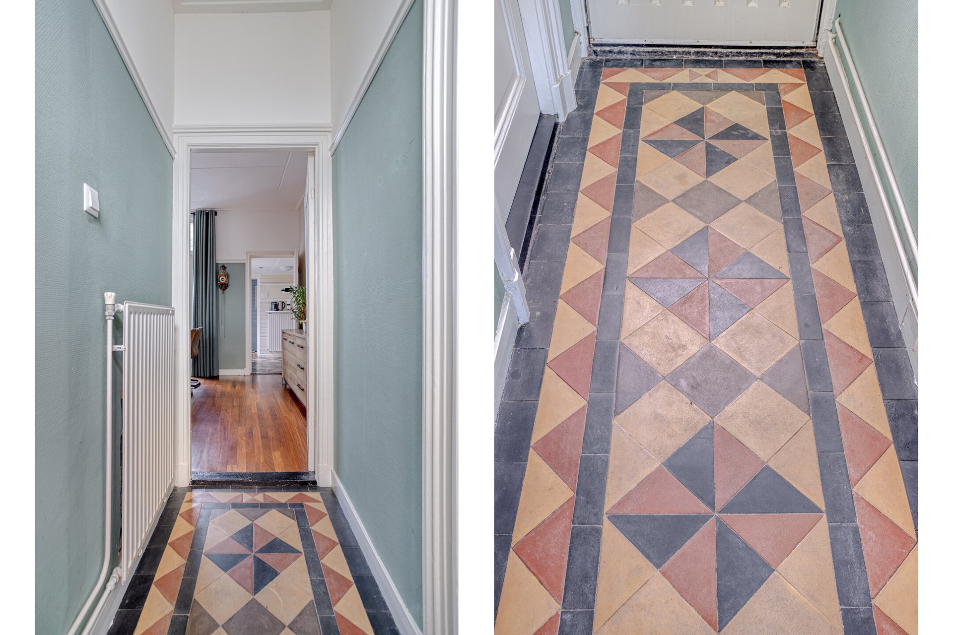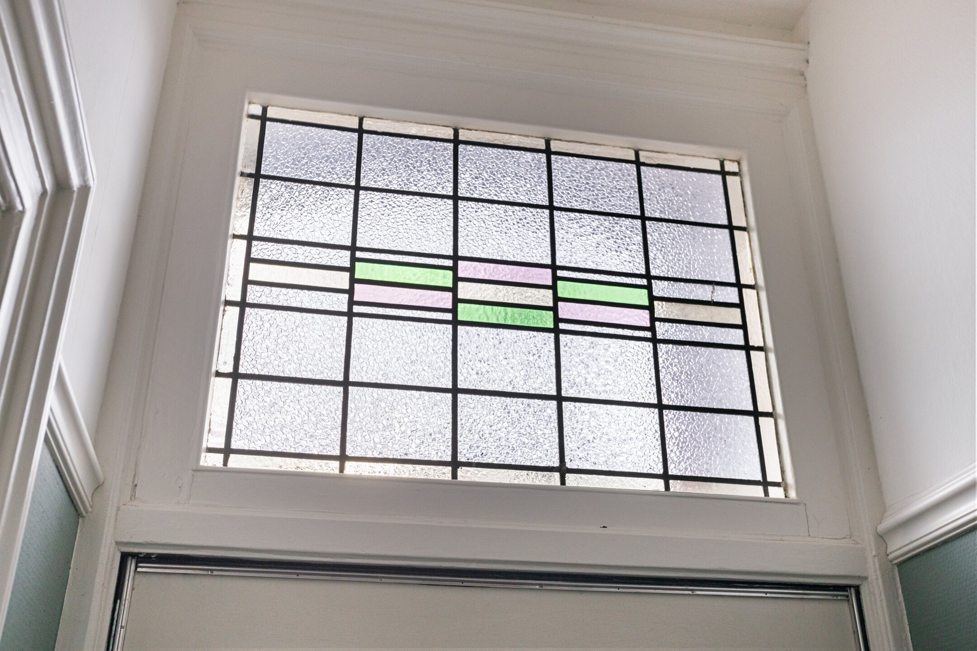 Authentieke details zoals glas-in-loodramen, een hoge voordeur en een prachtige schouwpartij