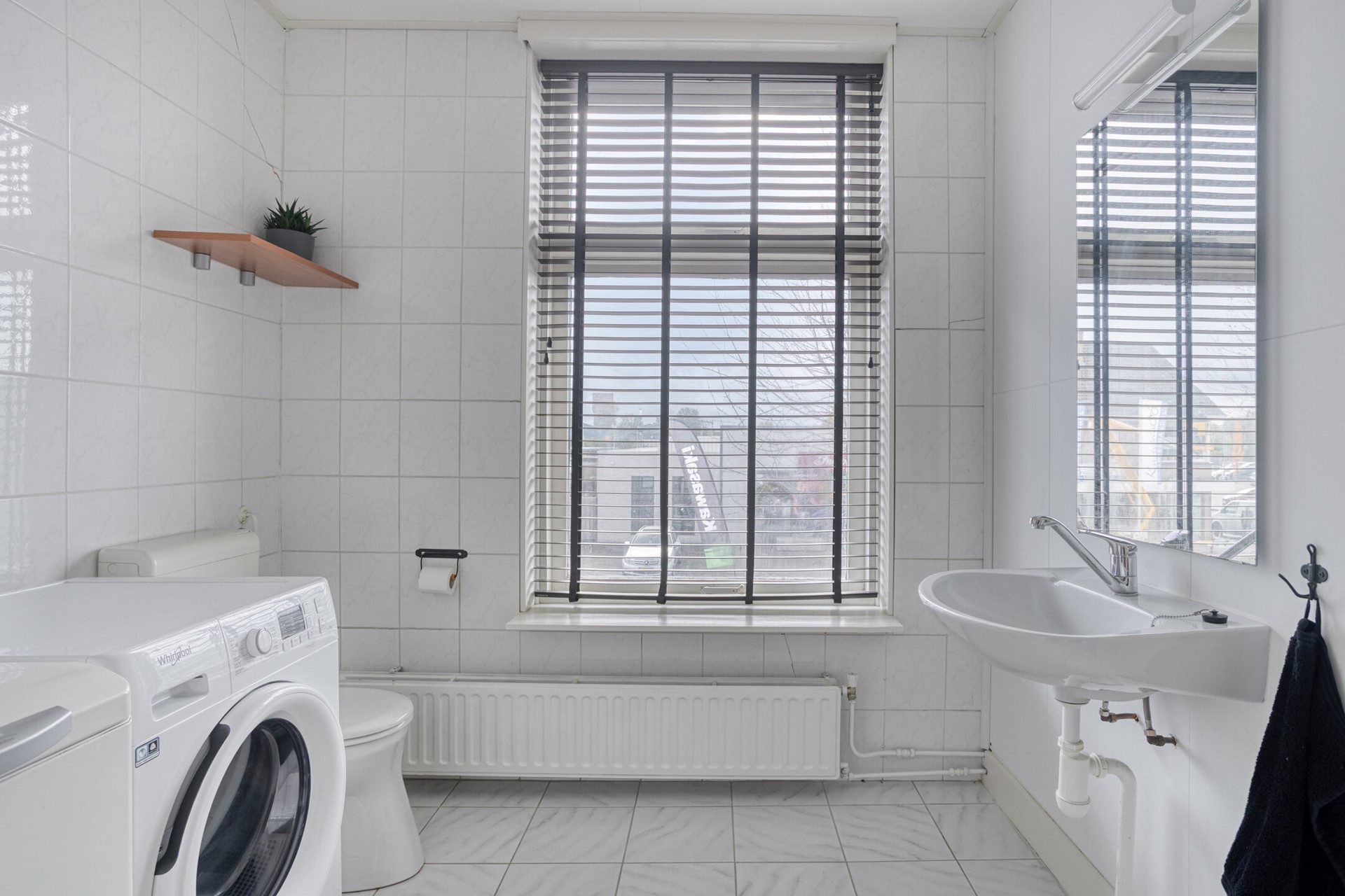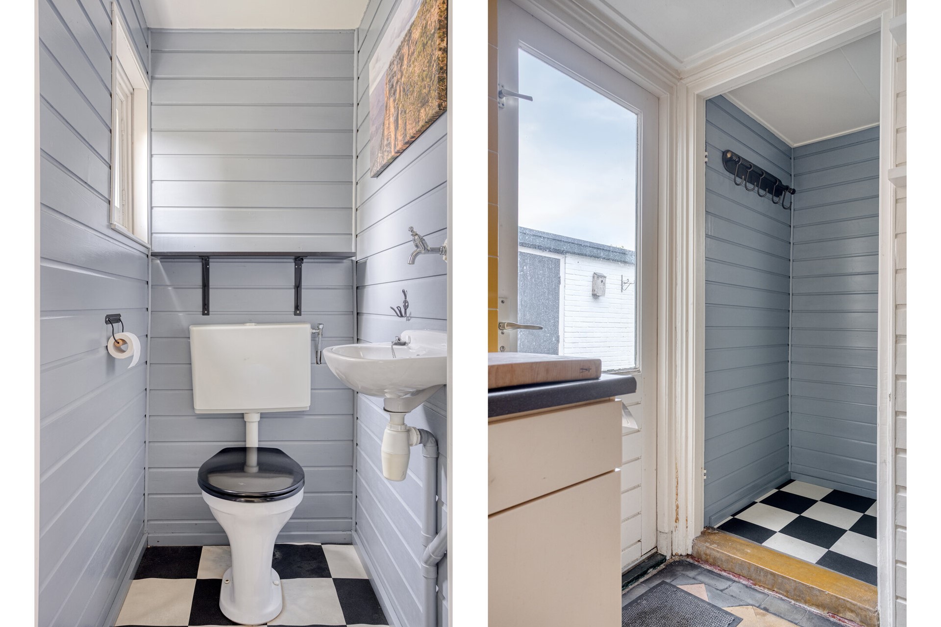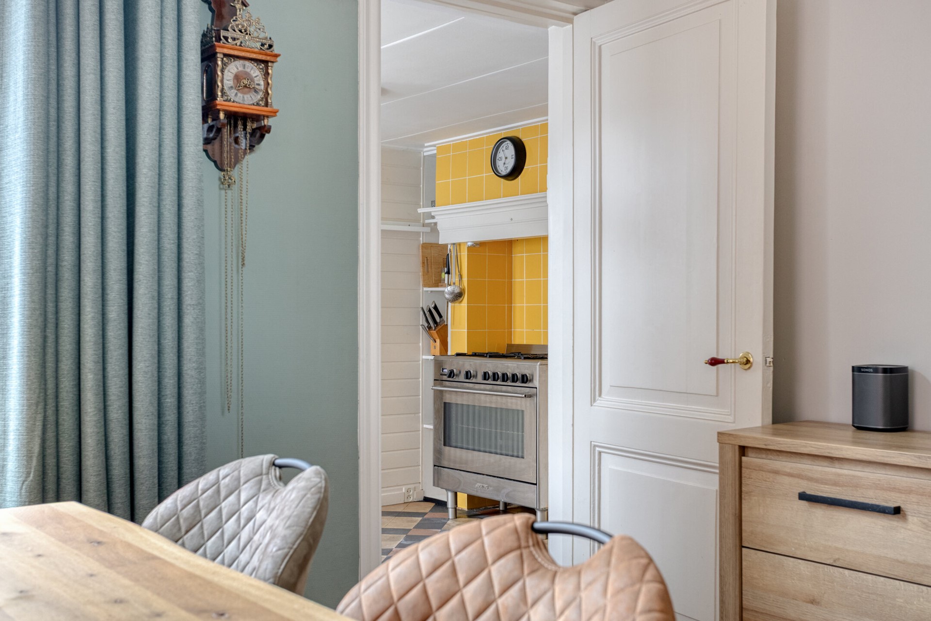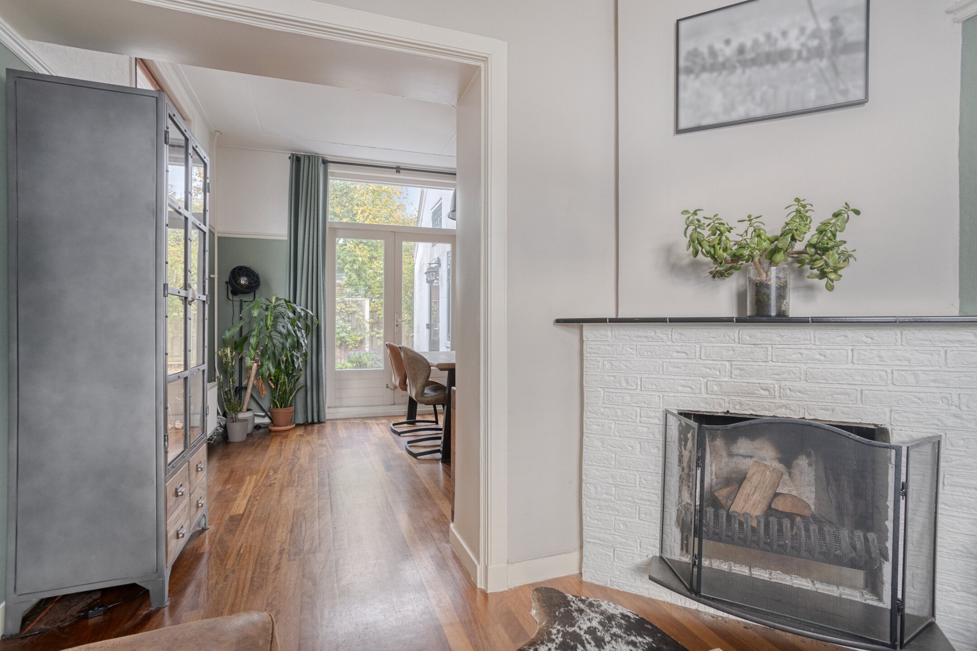 Bij binnenkomst word je verwelkomd door een charmante entree met originele details. Vanuit de hal stap je in de sfeervolle woonkamer met parketvloer, gezellige open haard, hoge plafonds en openslaande tuindeuren naar het terras. De keuken is praktisch ingericht, voorzien van een vaste kast en toegang tot de provisiekelder, achterentree en het toilet.